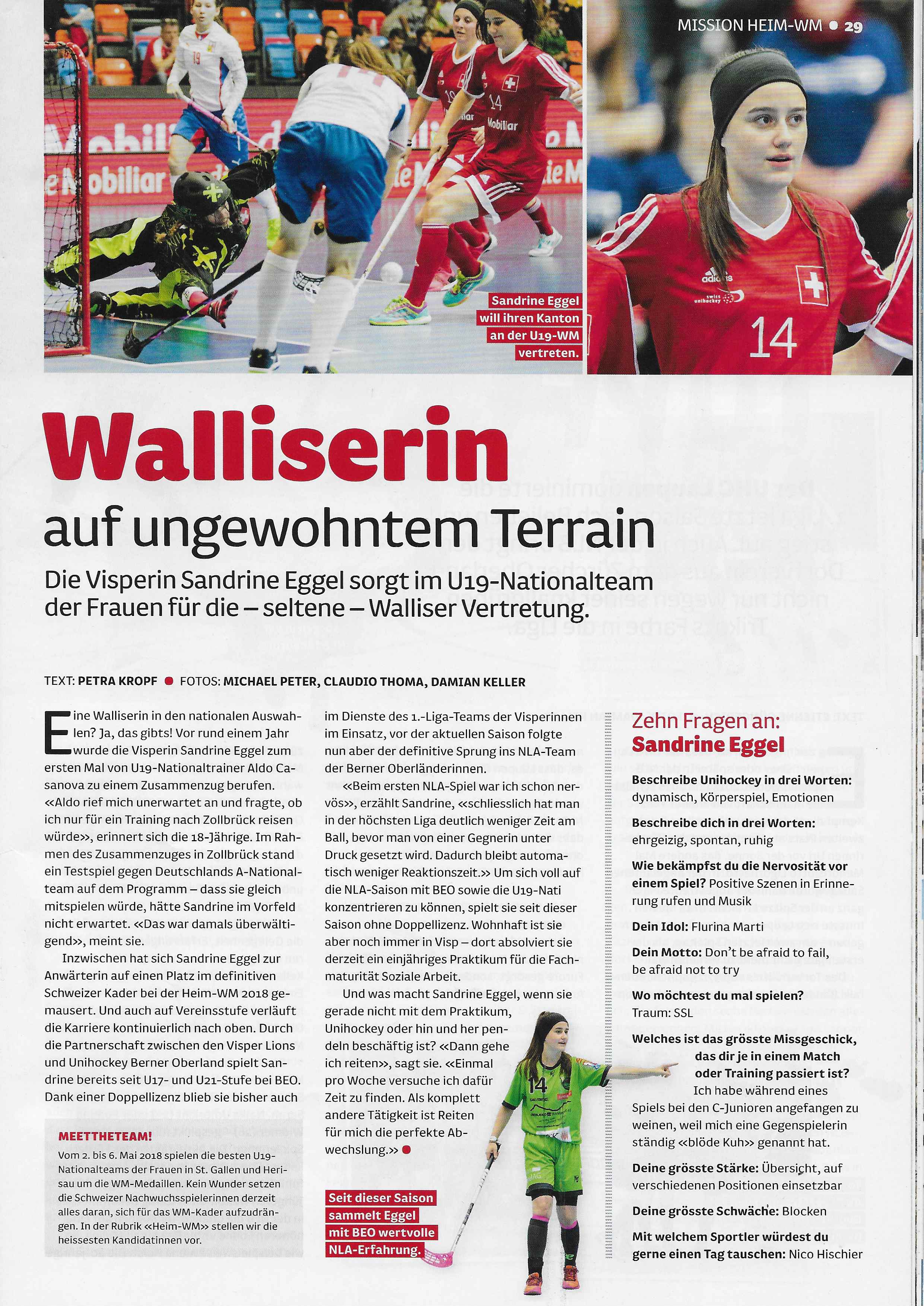 Die Visperin Sandrine Eggel spielt mit Unihockey Berner Oberland (BEO) in der NLA und gehört dem Kader der U19-Nationalmannschaft an. Der Artikel aus der aktuellen Ausgabe der Zeitschrift unihockey.ch:
