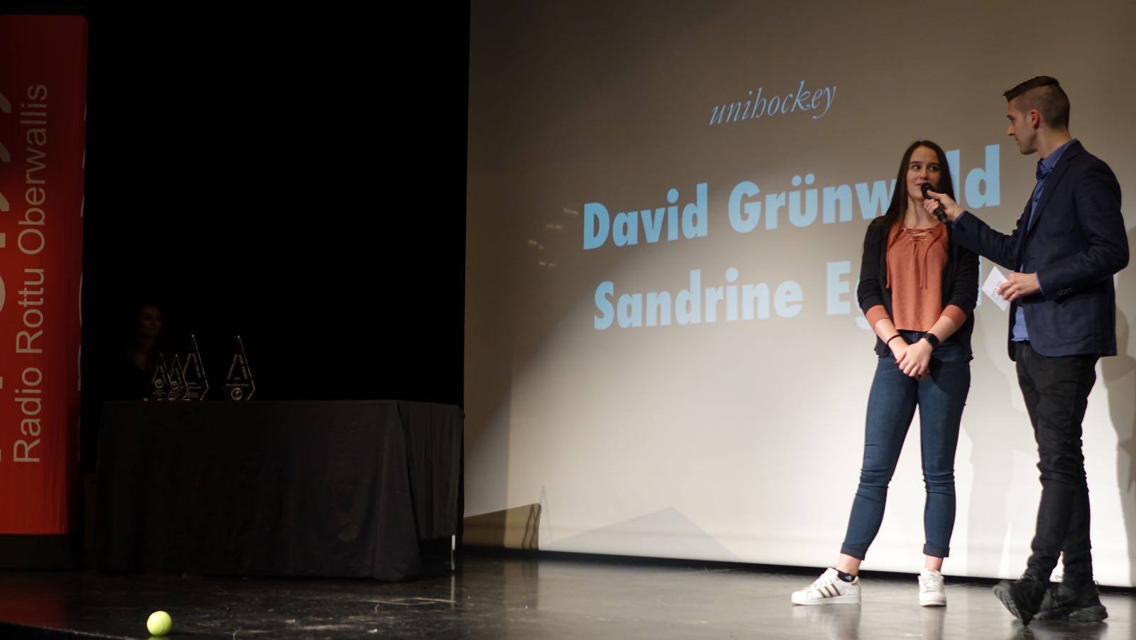 Les Sport Awards haut-valaisans ont été décernés hier soir à Brig. Des sports, tels que le volley-ball, le handball et l'unihockey, ont fait l'objet d'une présentation. Les lauréats Sandrine Eggel (joueuse des Visper lions et de l'équipe nationale M19) et David Grünwald (notre directeur sportif et entraîneur de notre sélection M15 Valais) ont été invités à prendre brièvement la parole devant l'assemblée. L'entraîneur de la sélection a souligné l'importance du développement des sélections juniors et est convaincu que l'unihockey valaisan est sur la bonne voie, avec la sélection M15 mais aussi avec les futures sélections M13 (garçons) et M15 (filles) développées par swiss unihockey.